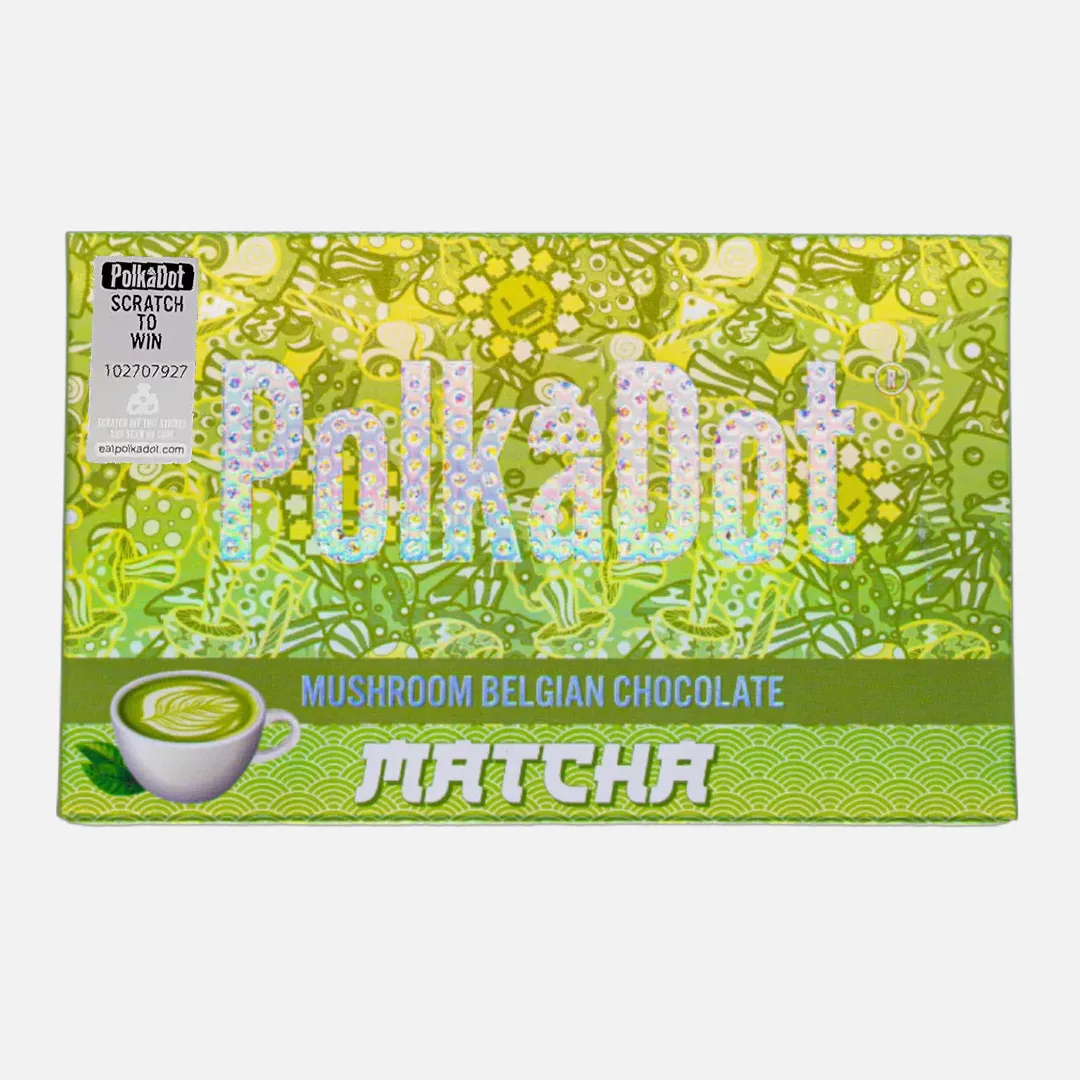 Discover the tranquil fusion of matcha and white chocolate in our Matcha Bar, a gluten-free treat enhanced with the mystical essence of magic mushrooms.